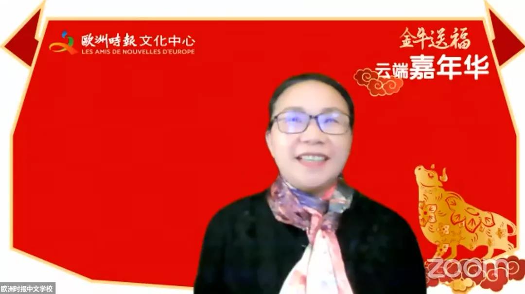 欧洲时报中文学校负责人徐嘉蓉老师向大家拜年。(图片来源:法国《欧洲时报》)