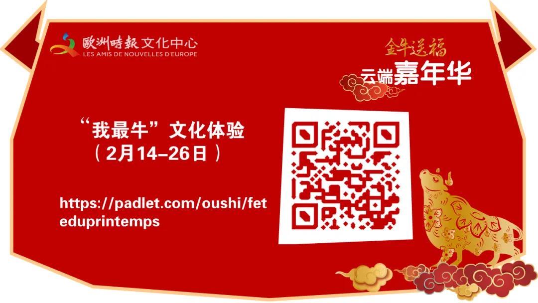 2月14日至26日,输入上图网址或扫描上图二维码,即可参与欧洲时报文化中心“2021金牛送福云端嘉年华”的“我最牛”文化体验活动。六个栏目:剪纸、折纸、创意书画、动手、动口、动笔,你是哪一项的小牛人?