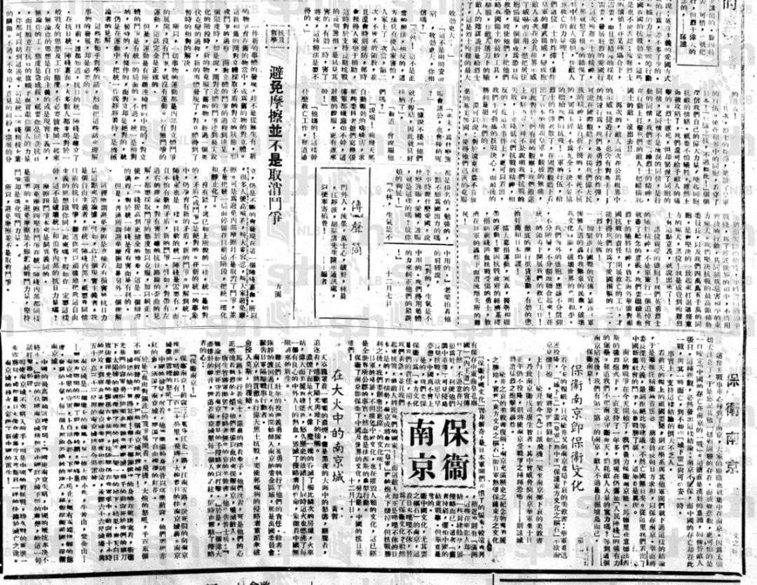 同一版块还刊登了《保卫南京即保卫文化》《在大火中的南京城》两篇文章,版面更以方章形式醒目标出“保卫南京”字样。