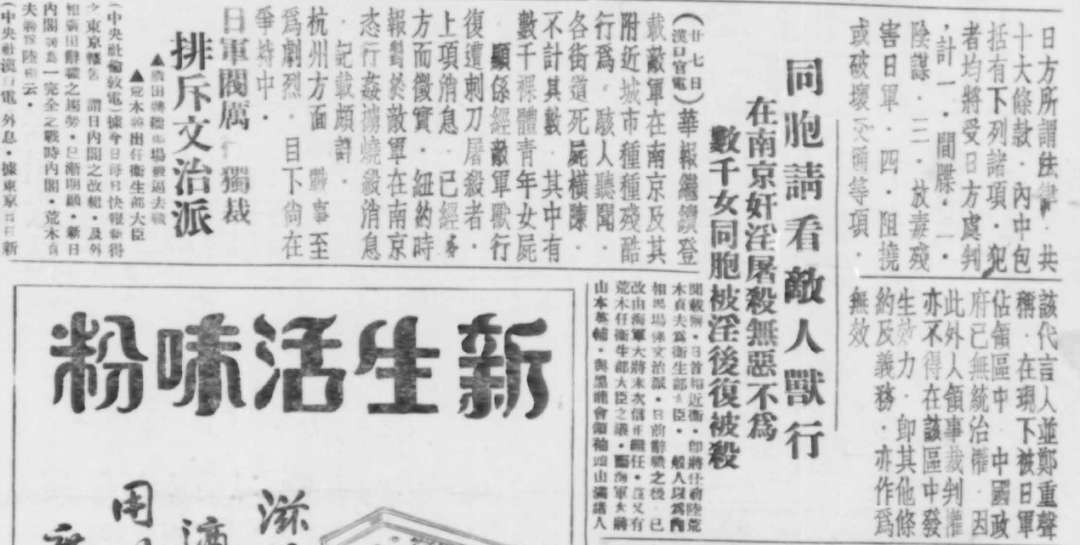 1937年12月28日,新加坡《总汇新报》在第4版刊登《同胞请看敌人兽性在南京奸淫屠杀无恶不为数千女同胞被淫后再被杀》,文中除描述日军恶行外,还提到“纽约时报对于敌军在南京恣行奸掠烧杀消息记载颇详”,从侧面印证了日军暴行的真实性。
