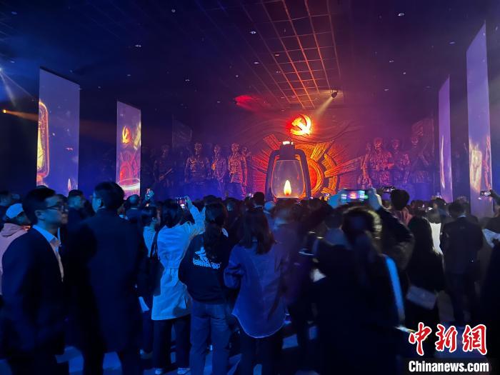图为“红飘带”馆内,华文媒体一行行浸式观看长征故事演绎。杨茜 摄