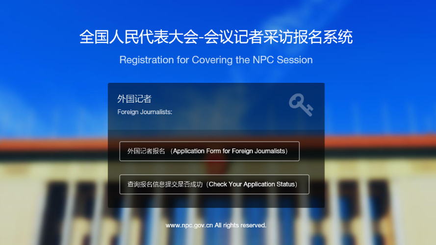 全国人民代表大会-会议记者采访报名系统地址为:https://zhbg.npc.gov.cn/qgrd/jzgl_xw/jzgl/login_jw。点击报名